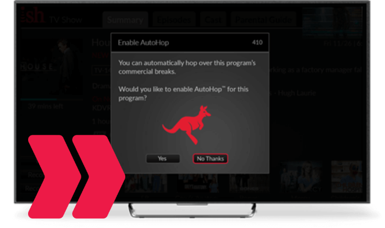 Our most powerful DVR lets you skip TV ads with a push of a button. With DISH AutoHop easily skip commercials on select primetime shows on ABC, CBS, FOX, and NBC.